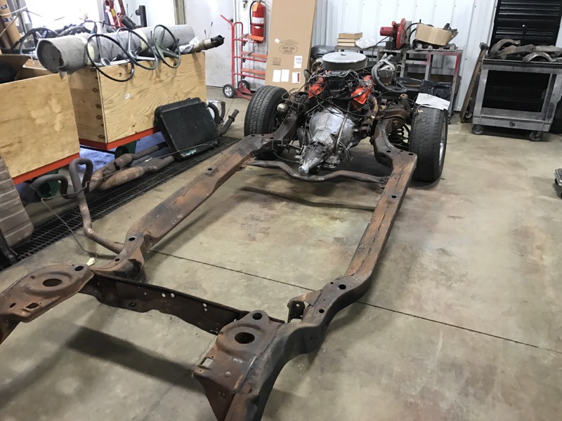 Been a while since an update. These pictures were taken today for the most part. Son-in-law Ron is more ambitious than I am. Stripping white ElCamino frame for blaster. Frame is as pristine as they get. Exhaust was kinda rusty. This was the car where the fuel line had a hole in it over the axel kick up. Body mounts were "dead" rubber, really compressed, causing wear thru.