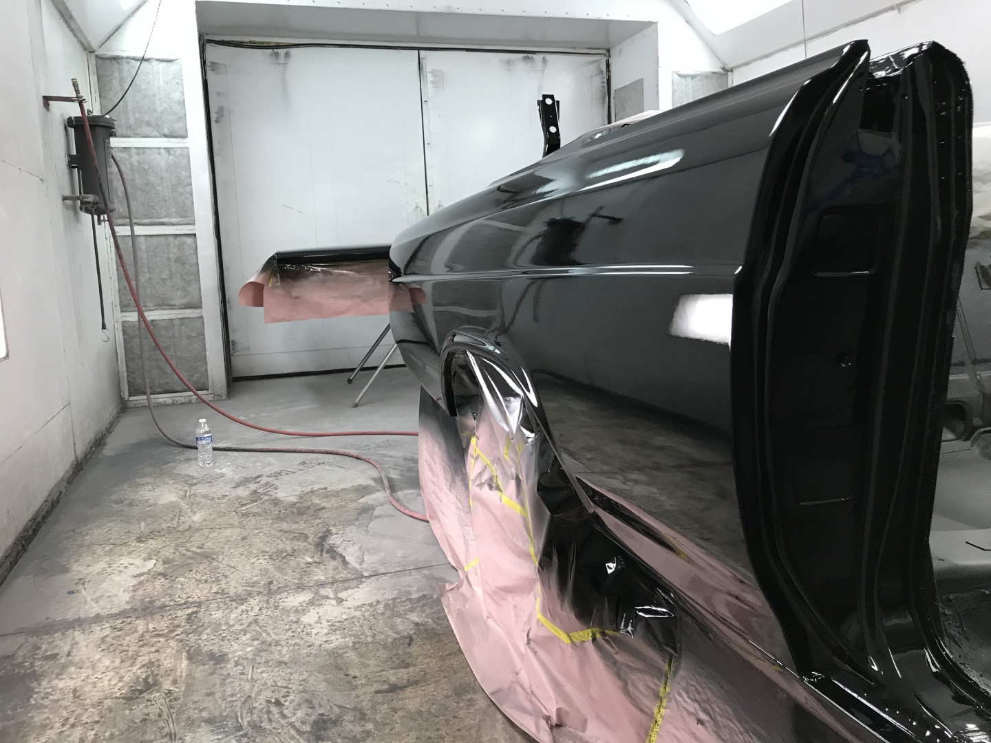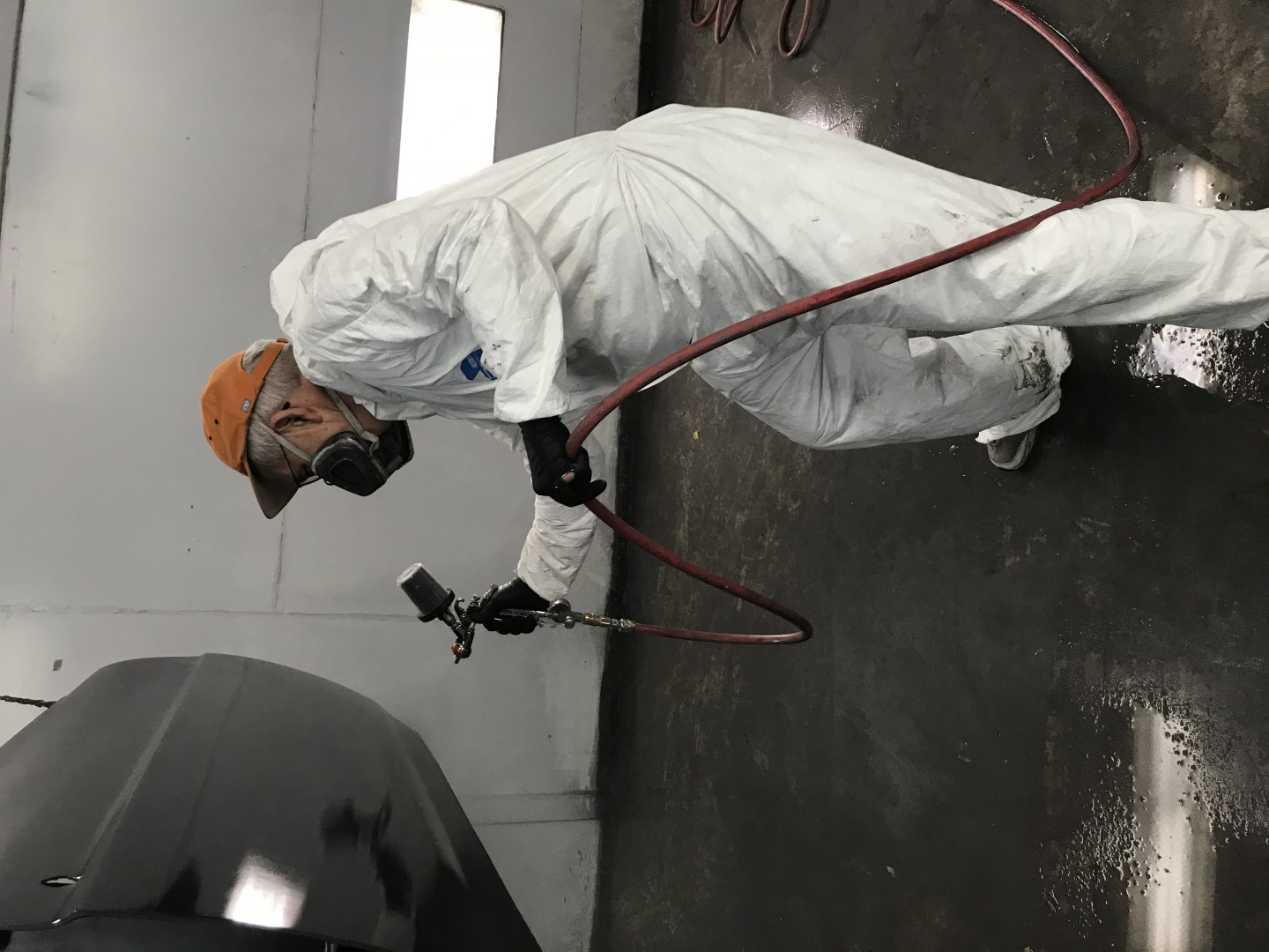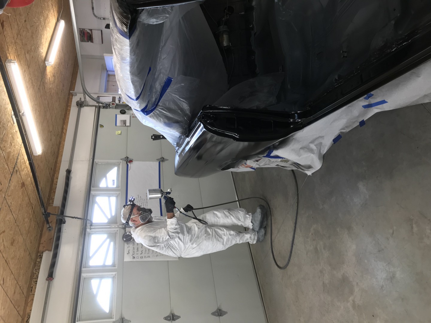 I started out in the moon suit then quickly got comfortable. One coat of black primer, two coats of black base then four coats of clear Dupont (now different name) paint.