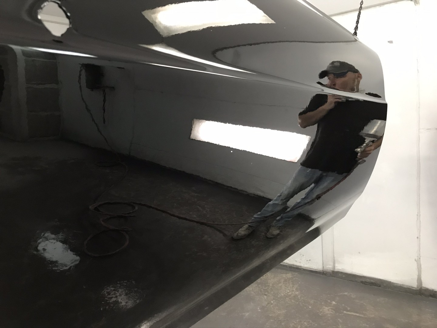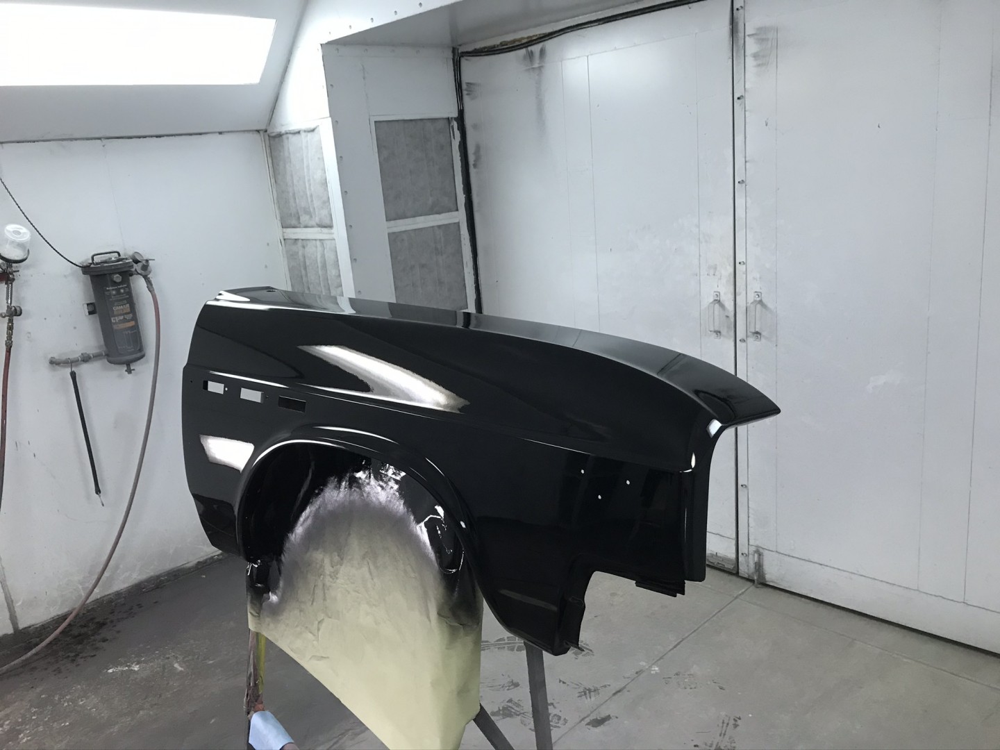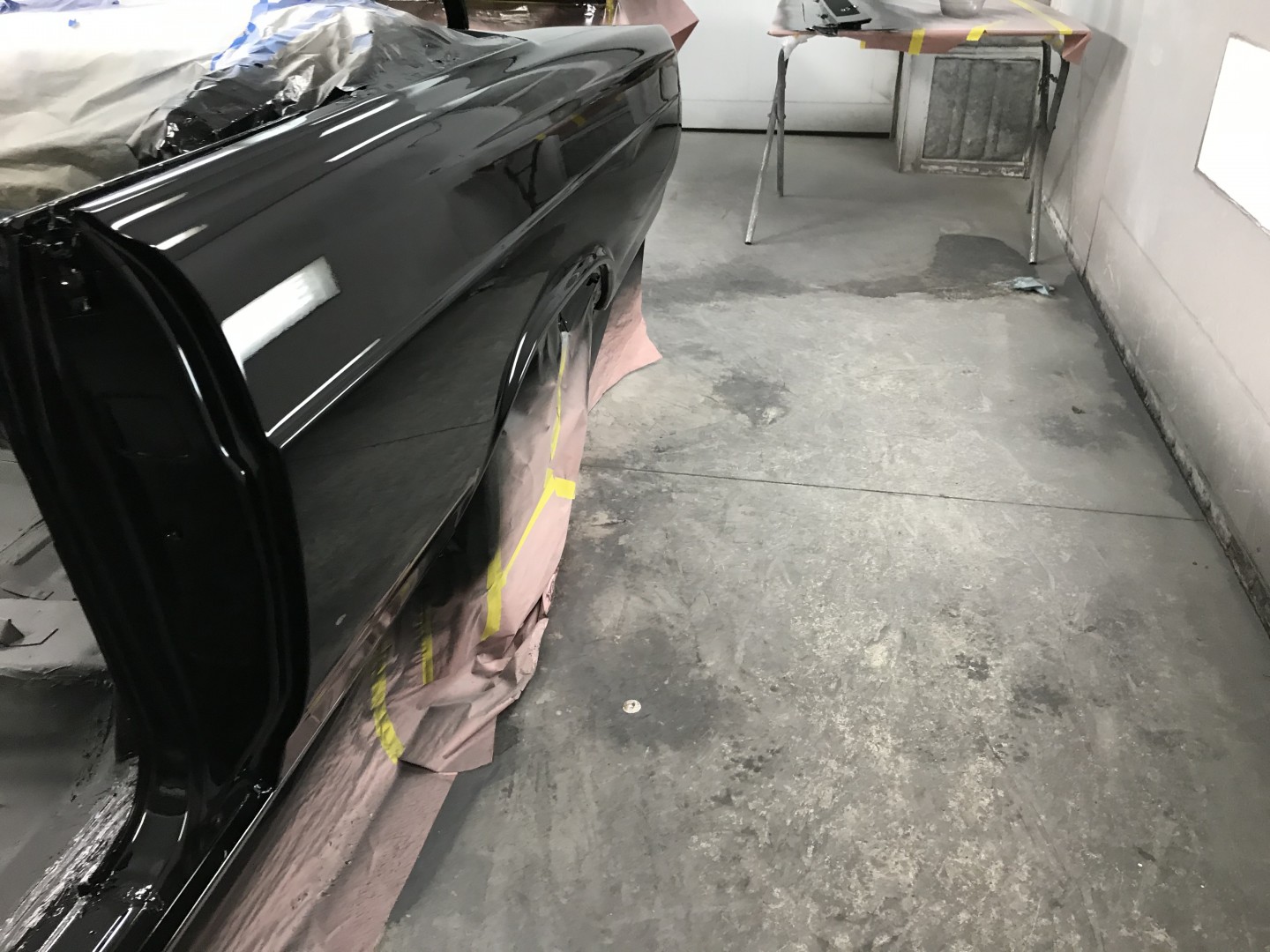 I started out in the moon suit then quickly got comfortable. One coat of black primer, two coats of black base then four coats of clear Dupont (now different name) paint.