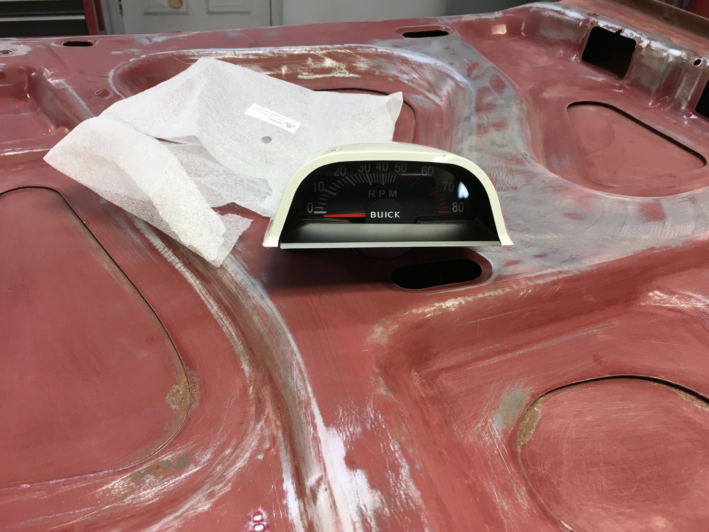 I’m going to install a hood tach, not original to this year Buick but I want one. I thought it would be a simple install, drill a couple holes for mounting bolts and one for the feed wire. But......nope I need to remove a good size area for the tach body that lives below the hood level. More on that later.