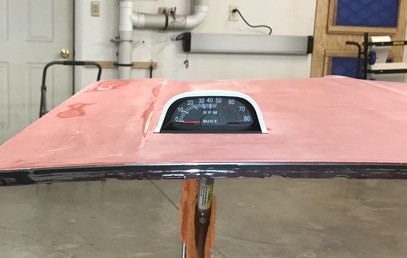 The tach install was more than I thought it would be, but its in. Paint on the inside of the hood is still wet when this pix was taken.