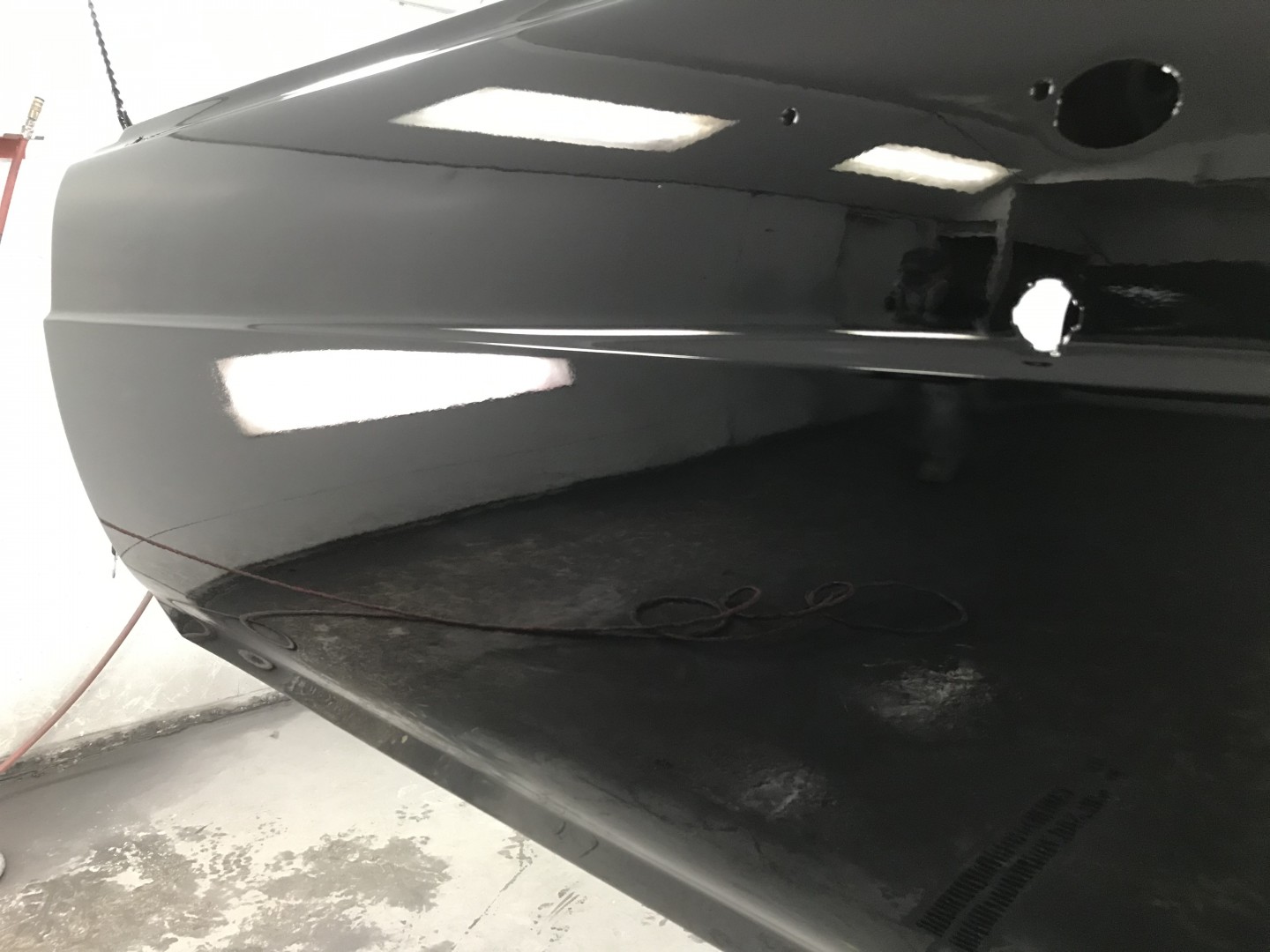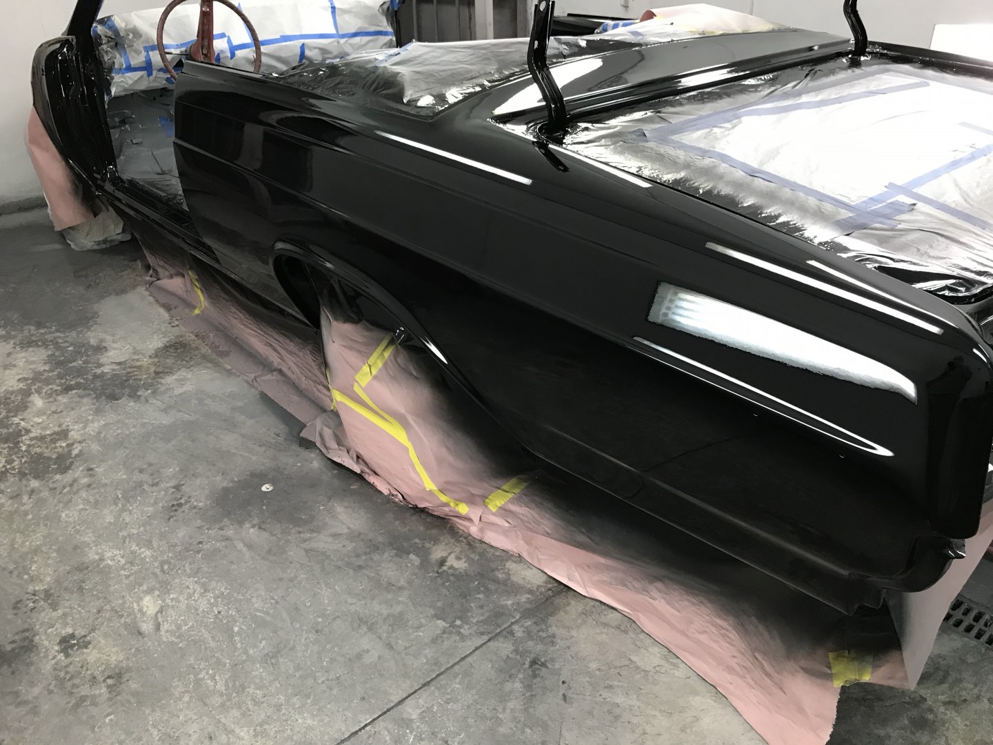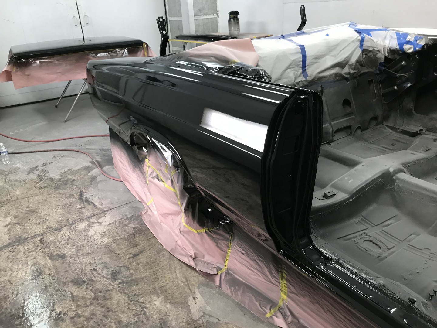 Using a buddy’s paint booth on an as available basis and receiving some excellent coaching and the use of a very sweet spray gun I’ve sprayed the my first paint; on my 70 birthday no less. I started out in the moon suit then quickly got comfortable. One coat of black primer, two coats of black base then four coats of clear Dupont (now different name) paint. Followed by sanding with 1500, 3000, 5000 then cut with Wizards Mistic Cut, recommended to avoid swirl marks in black paint and polished with 3M Perfect-it #3 polish. I couldn’t be more pleased and somewhat amazed with the finial result. I should be back on the project next week doing the fenders and hood. When done they’ll put in storage until the final drivetrain is decided and complete. Then the body and trunk will be done and mated together. The top and interior are on order, both black. Four to six weeks for the top and 12 to 14 weeks for the interior. So it looks like I may have winter project.