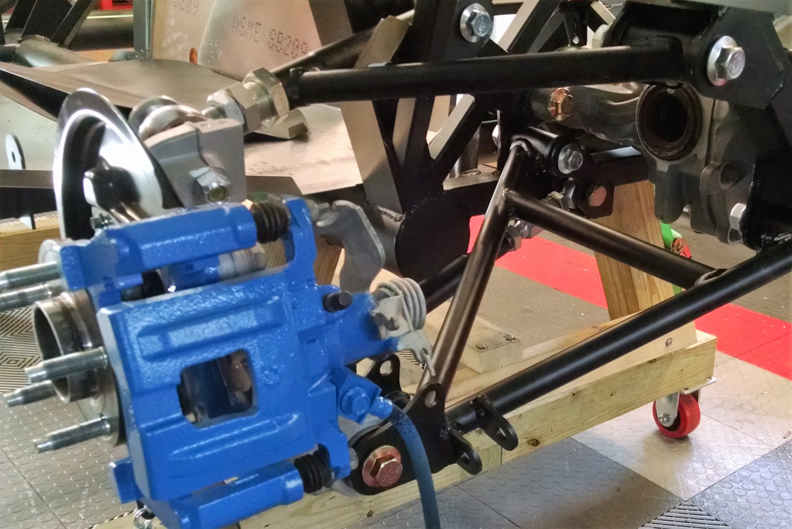 I wanted something that would get the car low enough to do the under-chassis systems (brakes & fuel) without doing abs crunches, and high enough to do the cockpit tin/wiring/suspension without stooping over all day. Plus have it safe, solid, and mobile without a lot of structure in the way.