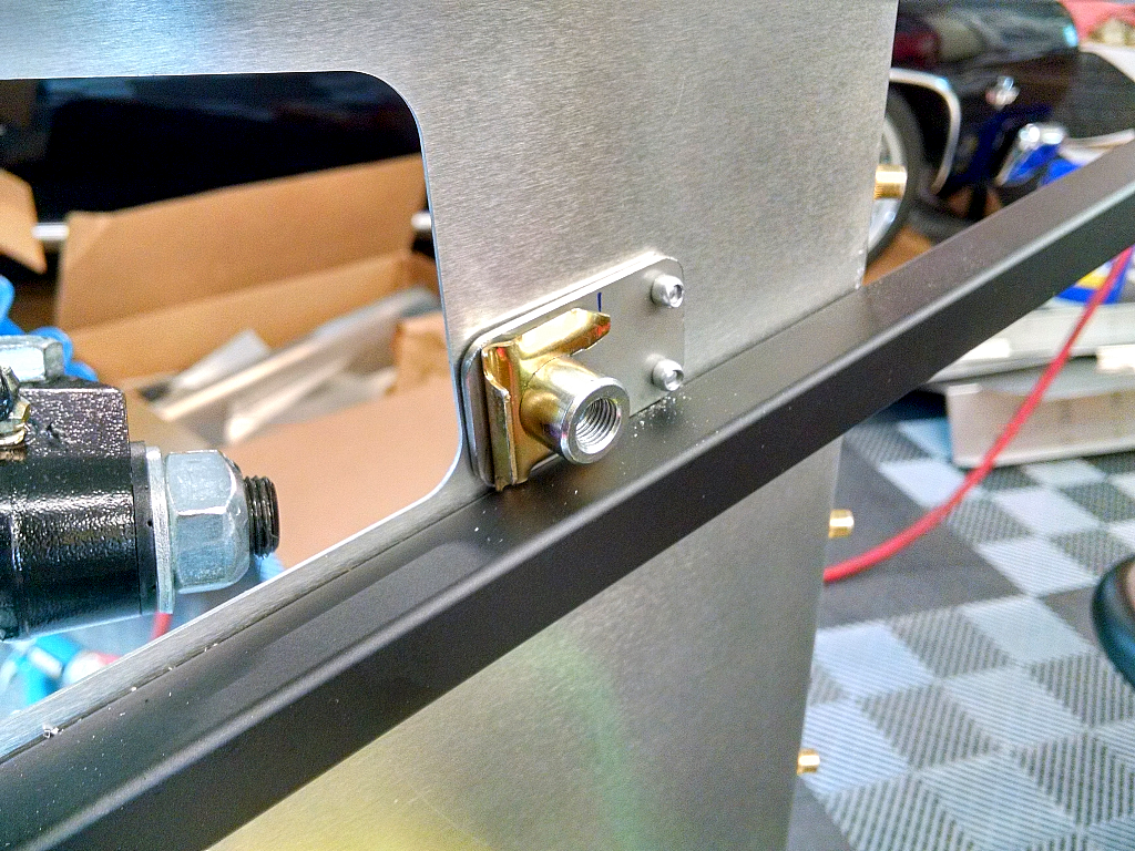 I received my Tilton 3-chamber reservoir yesterday, and spent a few hours fabbing a mounting bracket for it. Today was drilling, "NutSert'ing" the framerail, and getting it mounted and the supply hoses routed.