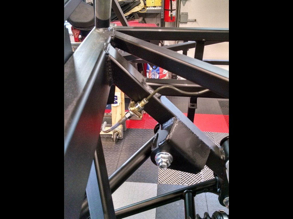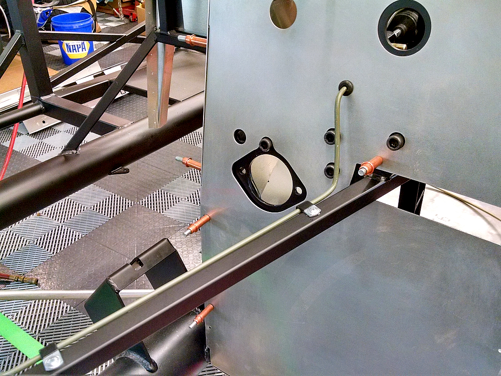 The hardest obstacle was keeping the lines away from the header & sidepipe location(s)... especially the rear. I've got to get out of the footbox and down the framerail, but I want to keep it out of the engine compartment. I found a neat little channel between some of the chassis tubing to break the rear feed line out of the footbox, clear of the pedals, and out down the frame.