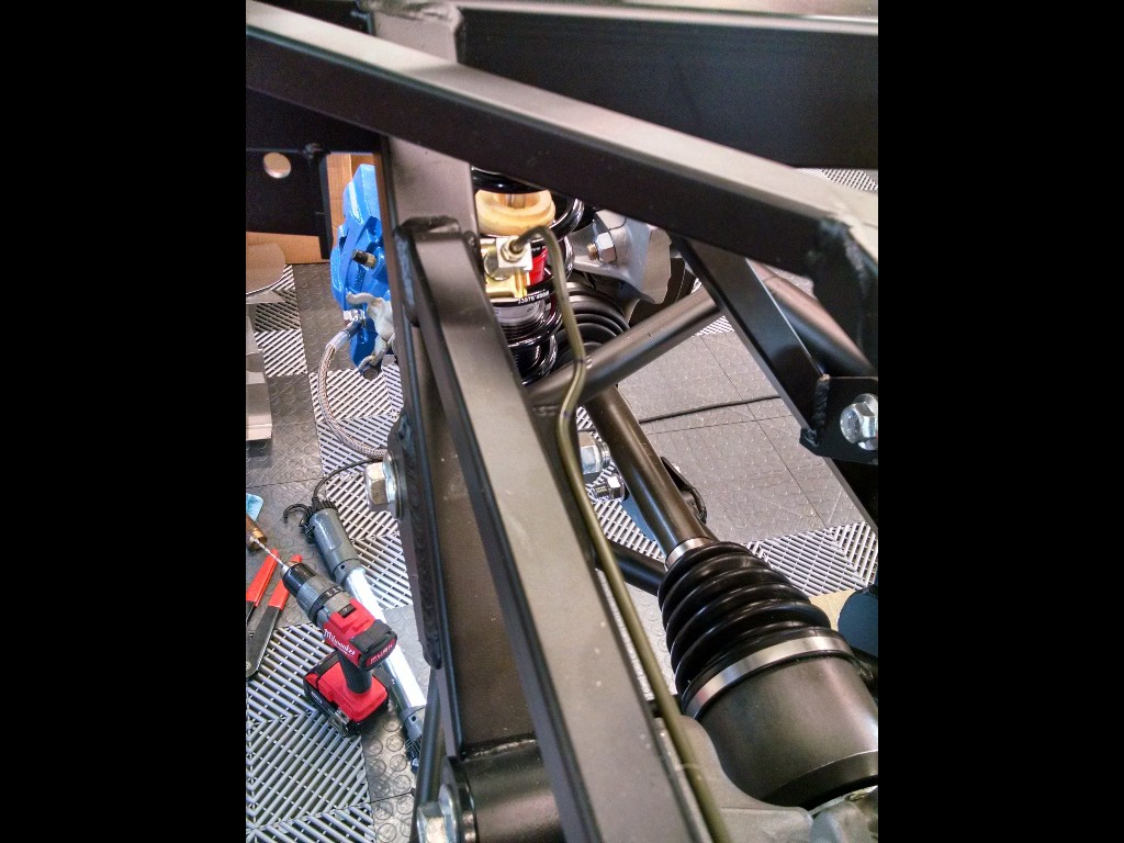 After gathering all my parts together I got started assembling. I am impressed with the weld & jig quality by FFR. I didn't have any problem getting the lower A-Arms into the sockets, although getting a wrench on the upper A-Arm cross-shaft nuts is a bit tricky.