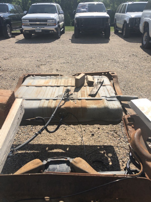 Fuel tank bolts to frame, with brackets, not body. Filler neck and transition hose go from tank up to quarter panel. The only tank connection to body is the ground wire, and filler neck attachment to fuel pocket.