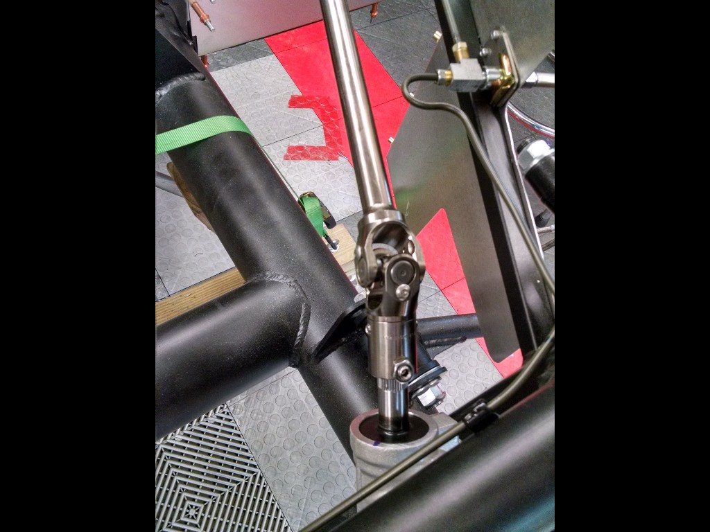 FFR's jigs and welders must be totally pro's. The rack dropped in without the slightest fight. A little nudging with some big drift punches through the holes and the bolts pushed in by hand. The steering shaft is stainless "welding porn", and I'm really tempted to sit in it and make engine noises now.
