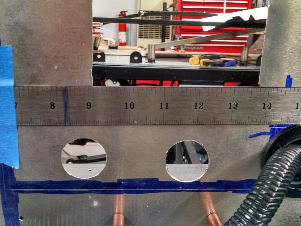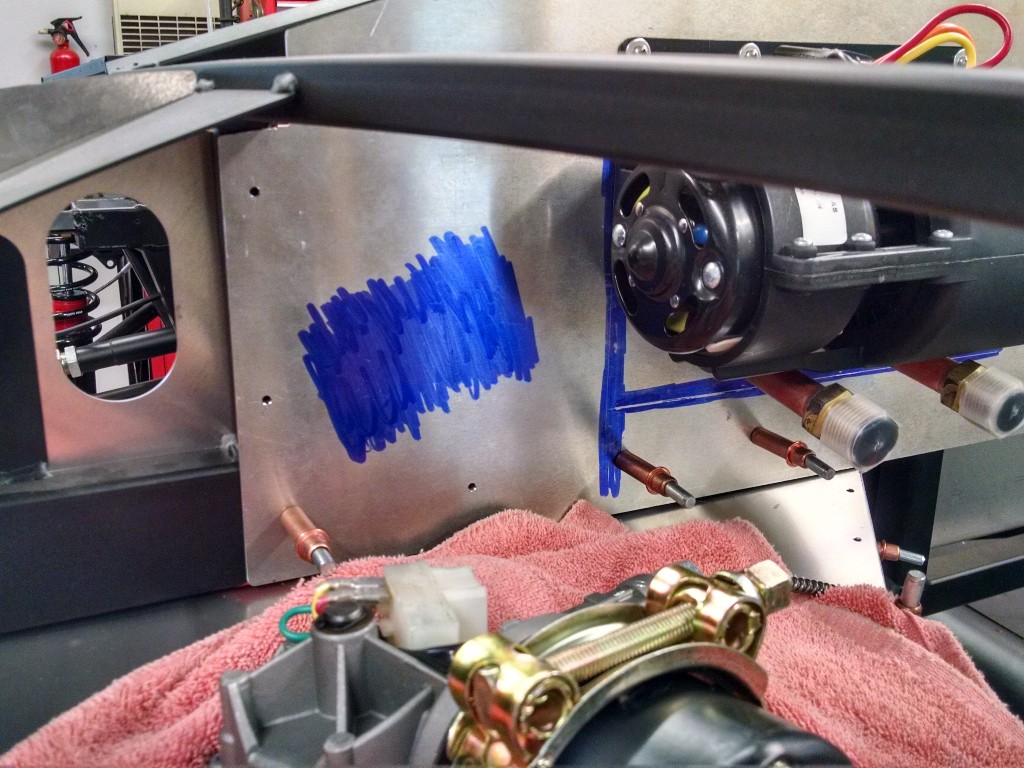 Heater: FFR/Vintage Air supplies a very nice template for cutting the firewall... except it isn't quite perfect. The holes for the inlet/outlet aren't quite in the right spots. The pic shows just how much "off" the inlet/outlet holes are. Measure twice... cut Once.