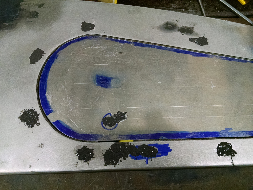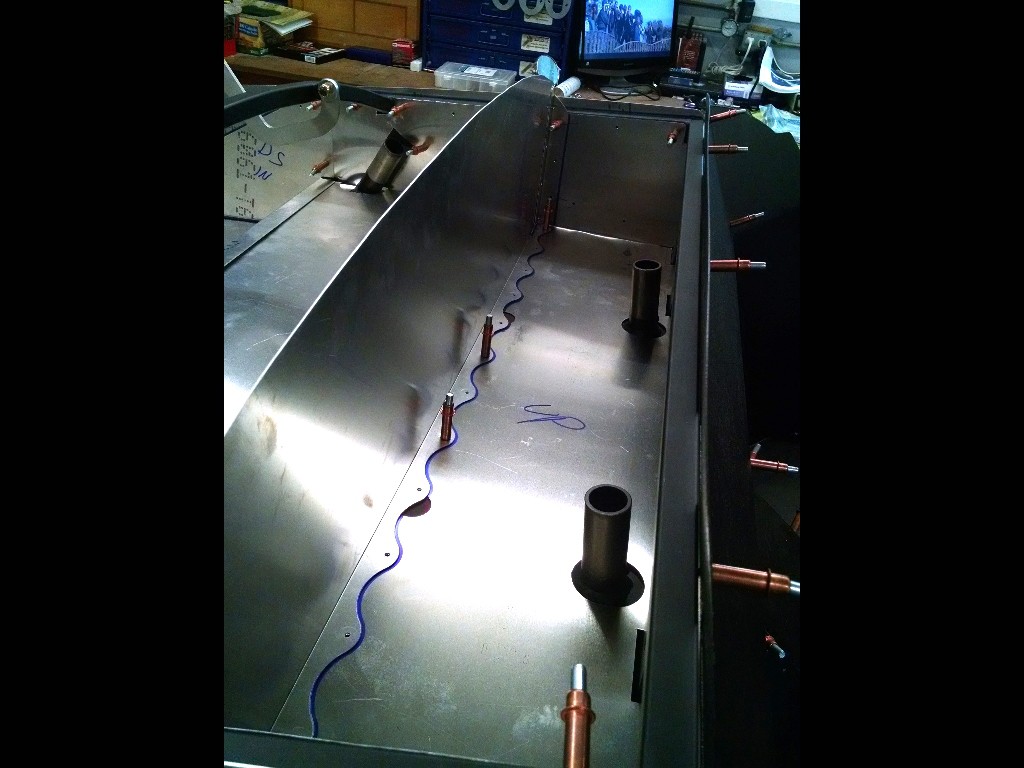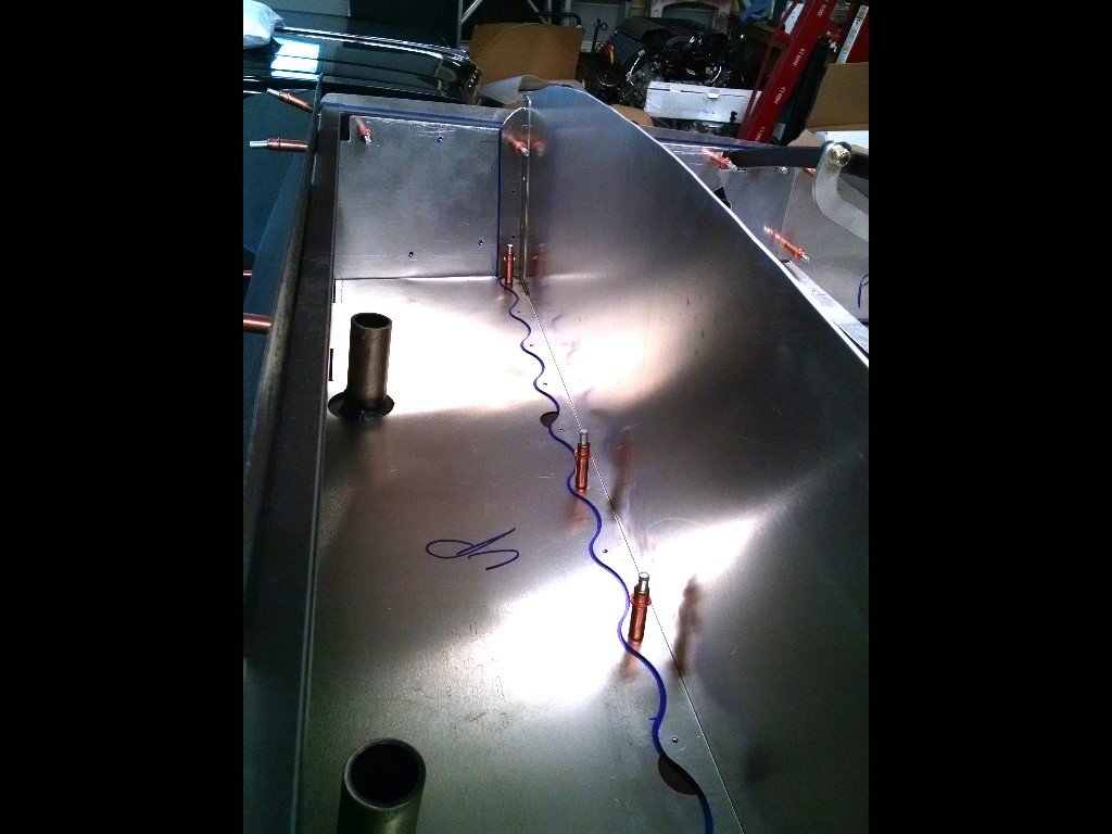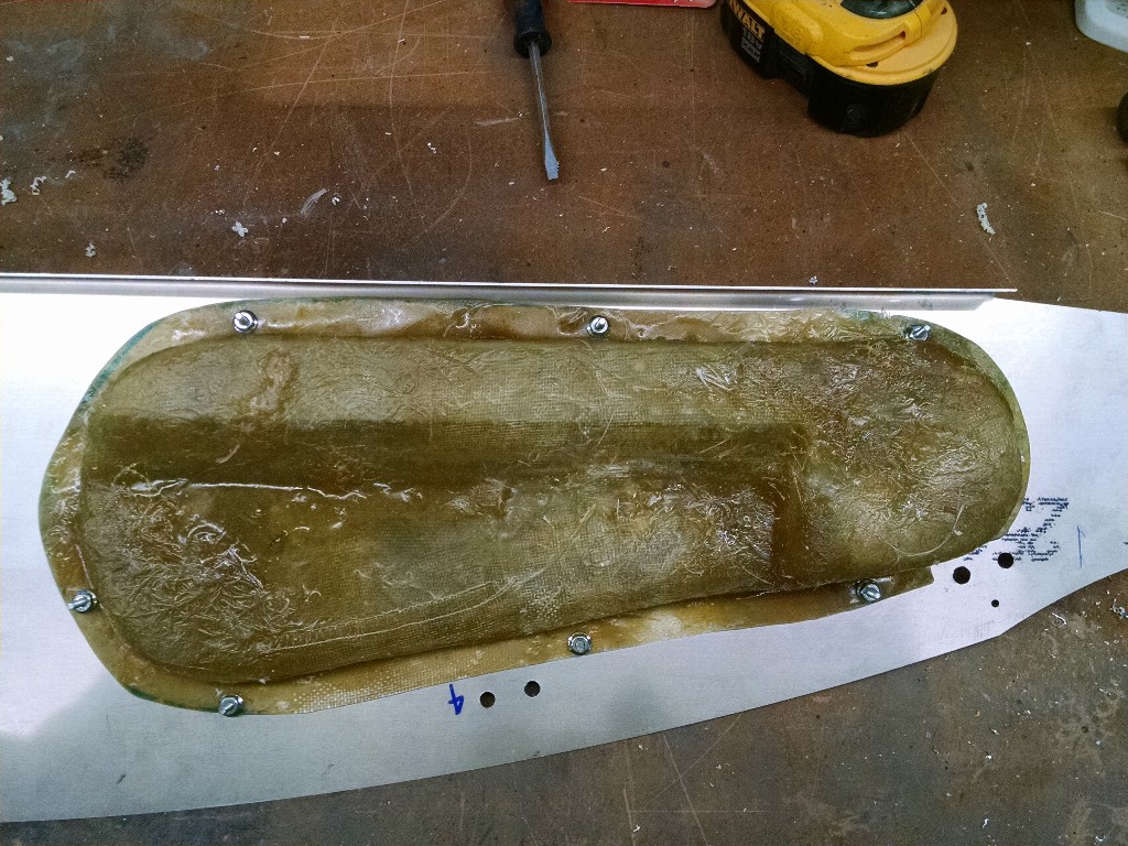 The plan is to do two coats (finished) on underside/exposed to elements sides, and one coat on interior sides. After final fitting, sealing and riveting, go back and apply the 2nd coat (on the interior) to seal everything up.