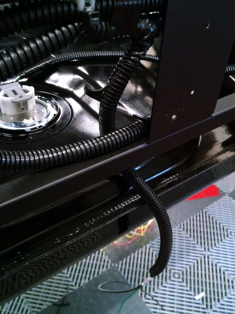 I'm not going to detail a lot of pictures, as this job is simply pushing a wire or two into the rear harness zip-tubing. The dropped trunk floor necessitated moving the rear harness to the PS a bit. Once above the rear diff, it'll angle over and run between the fuel tank kickup and the box.