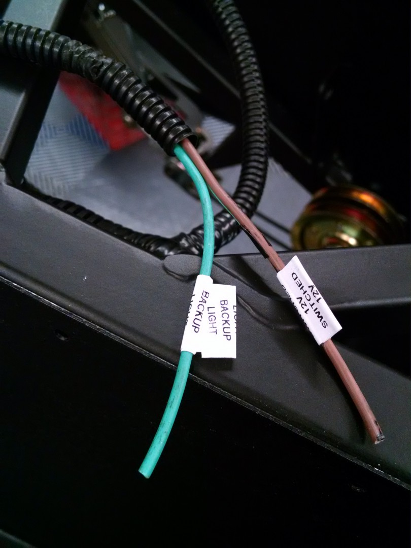 This shows where I dropped the transmission switched +12v “backup” light wire out. It’s about center in the rear, and I added a ground wire (T-tapped into DS lights ground, and also landed to the steel center support plate).
