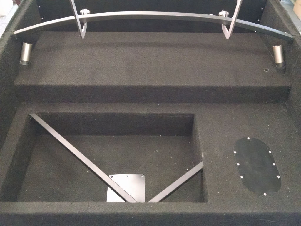 During the thought process for this, the question of upholstery came up. I didn’t want carpeting all the way up the rear cockpit wall – I wanted to transition to same material as the dash & future door panels on the area where the cubby hole is.