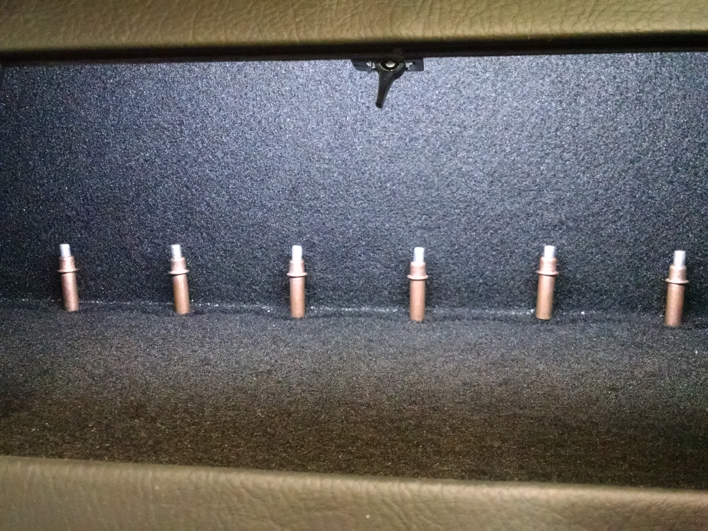 I put a piece of tape over the mounting holes of the glovebox & hinges, and pre-punched a hole in it. You don’t want the JB-Weld squeeze-out bonding the glovebox & hinges to the dash panel!