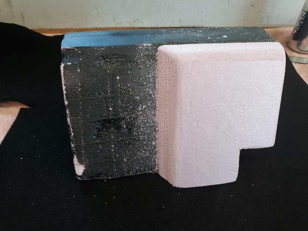 Sheryl also noticed a need for something. Even at 5'10"+ she had another five inches of room to the back wall on the passenger side. Same thing... nowhere to comfortably rest your feet against, or "bolster" yourself. I had some leftover foam sheet from Glovebox #1. I glue-stacked it together, shaped it, and had her give it a try... Good but not great. The seats in the Roadster aren't straight forward, they parallel the trans tunnel. They're canted outward about an inch. I added another piece to the right side of the bolster and now it's perfect. Some leftover trunk carpet and it's done.