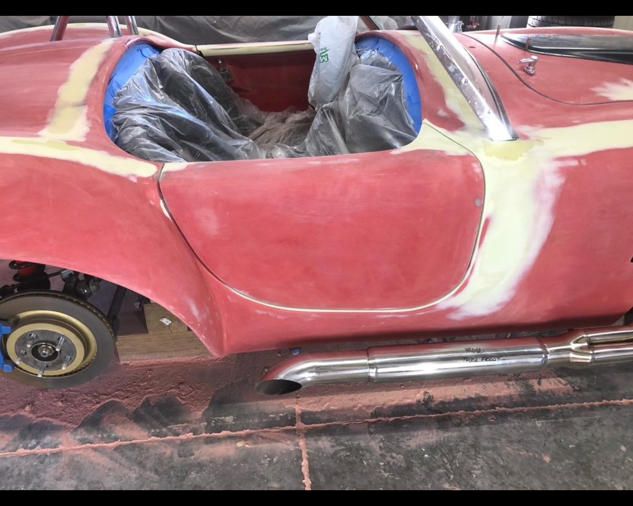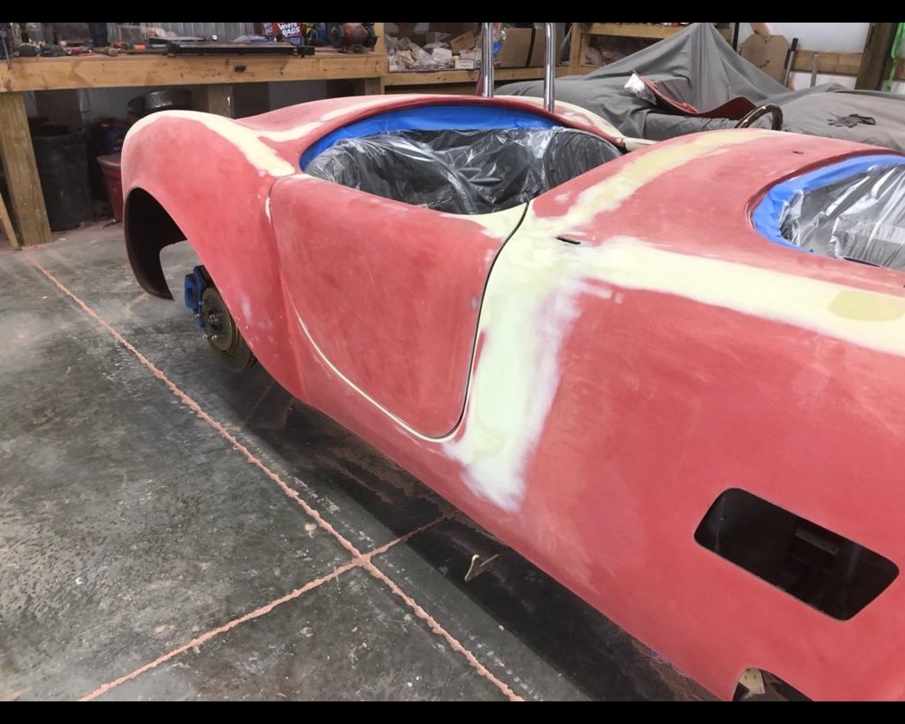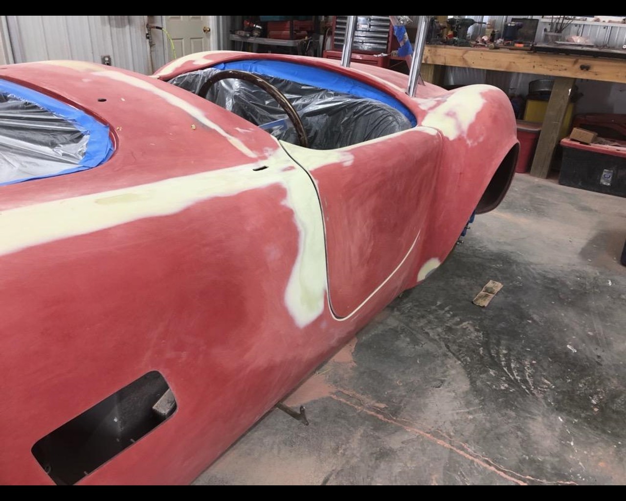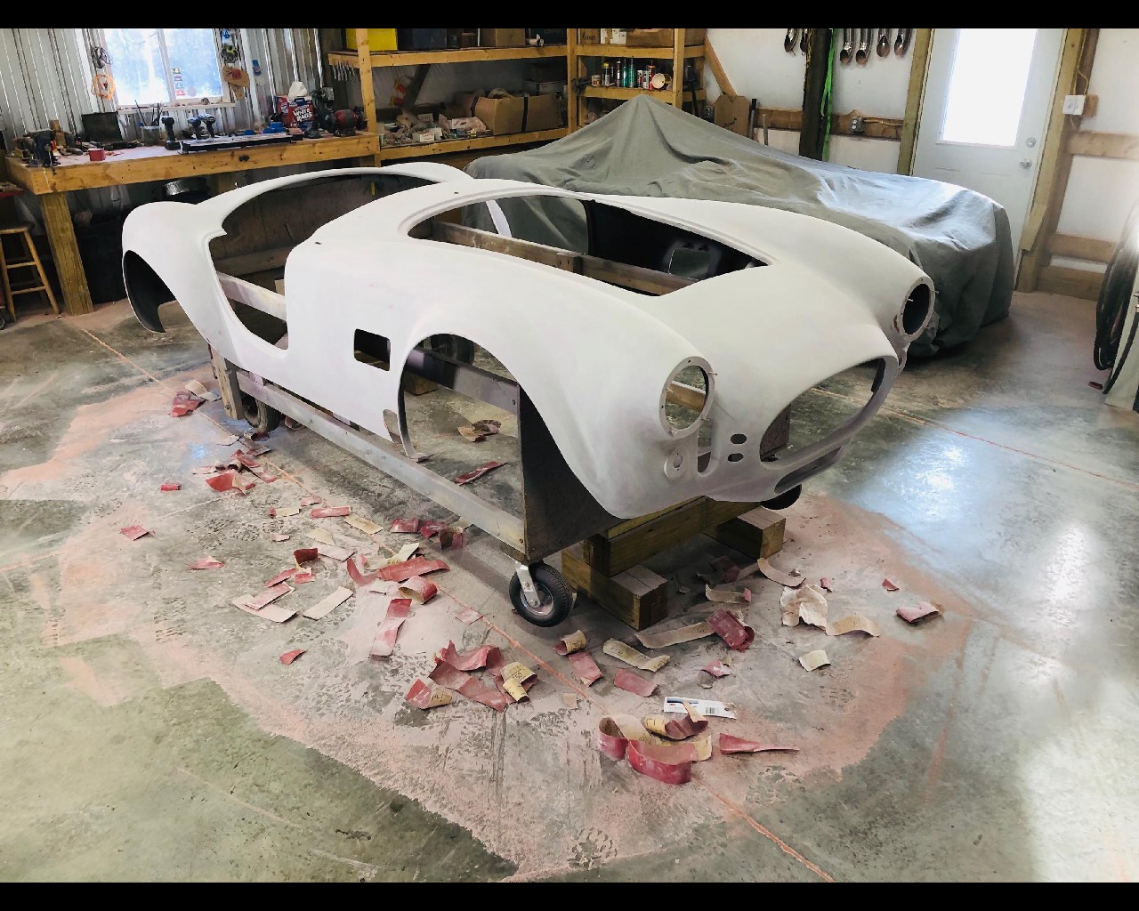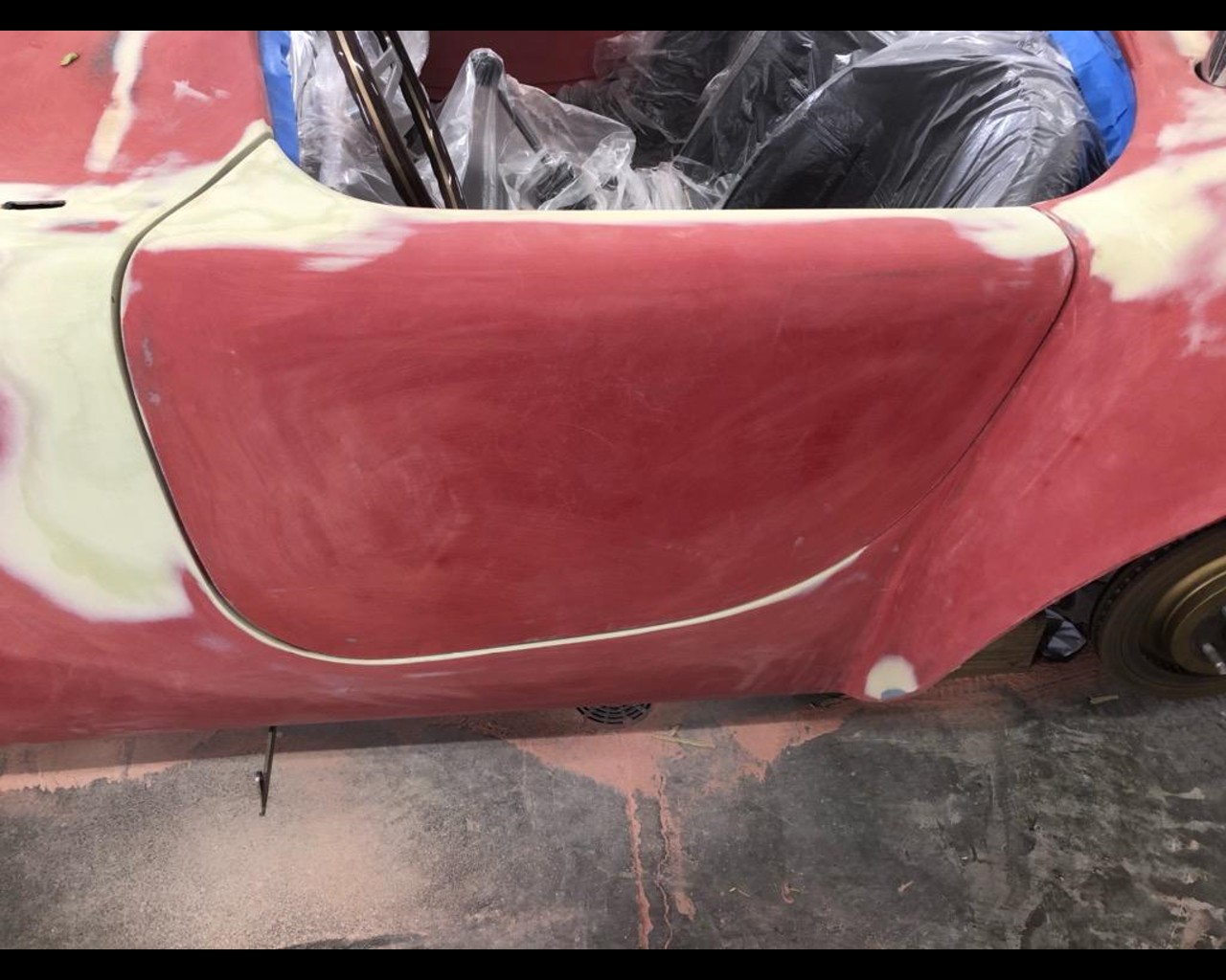 "The body was pulled from the frame, the rough cutting (trimming the wheel & grille openings), and body seam sanding work done. The 1st coats of "mud" went on last week."