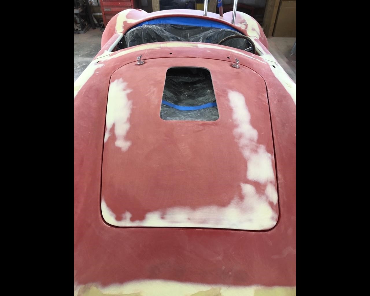 Hood & trunk lid are now on, adjusted, shaped and gapped and the windshield is installed. I'll put the sidepipes on in the AM to recheck their fit, set the scoop and at that point the mockup will be done...then it all comes apart again."