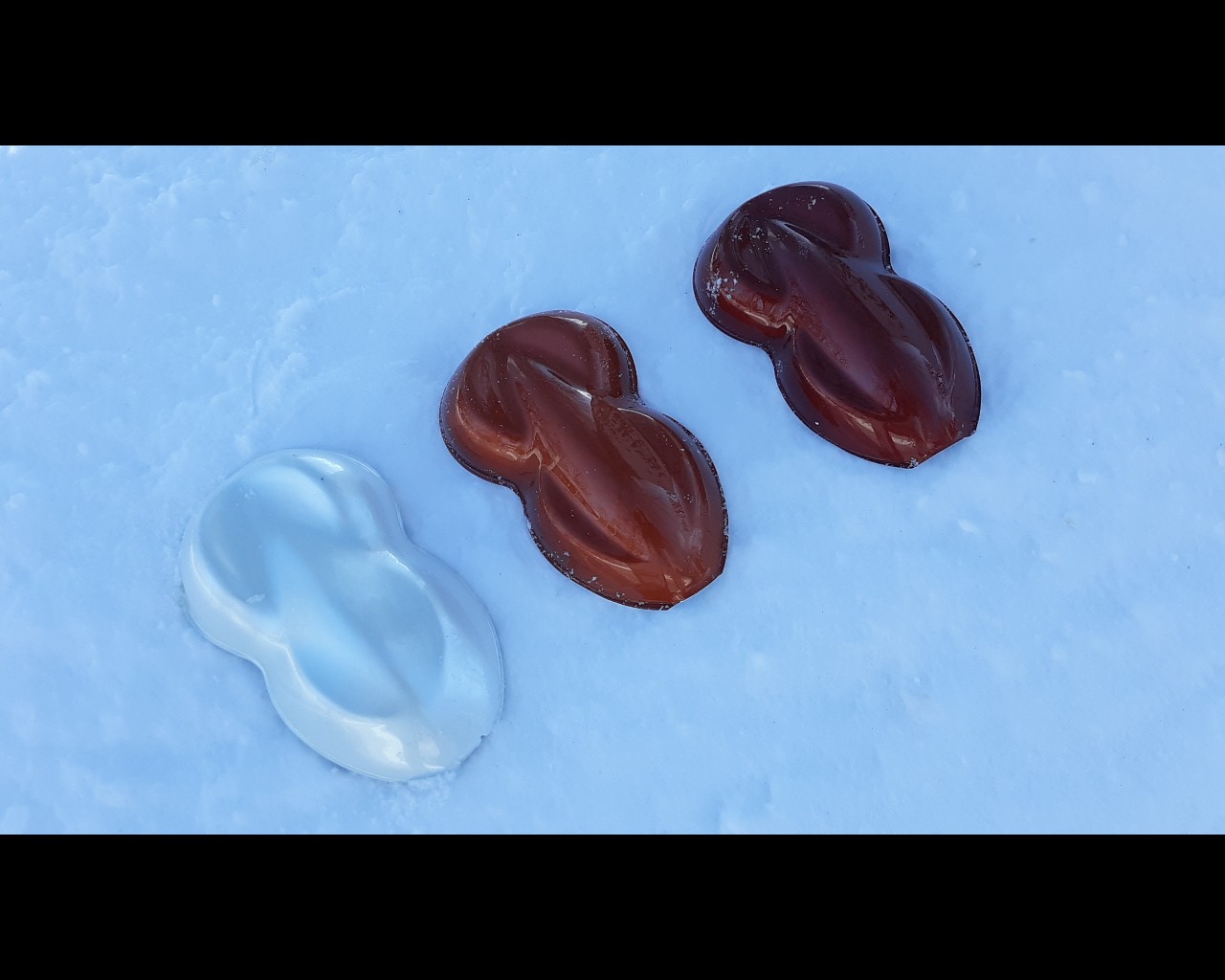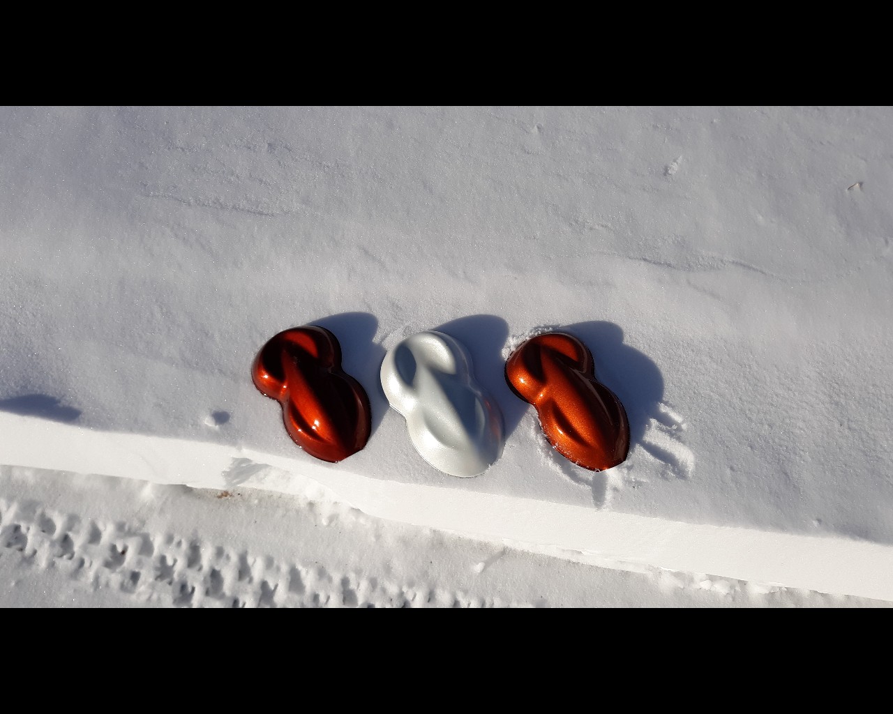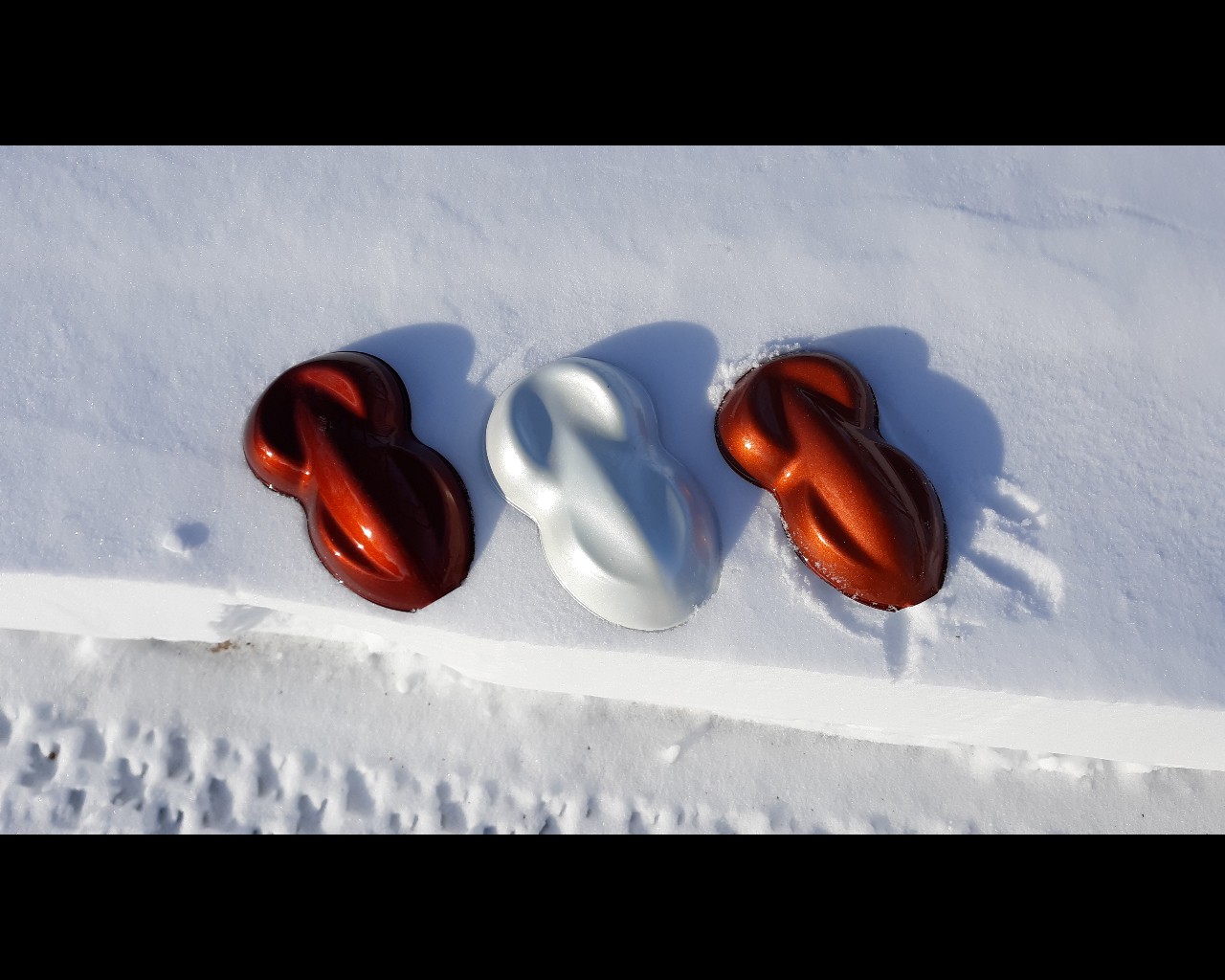 The objective was a coppery/burnt orange - that would "POP" in sunlight, but not go to "Mud" in shadow... but not into the tangerine orange end of things. The stripes would be an off-white, with a hint of pearl. He's got a favorite pearl white he's used on many cars, so I'll trust his judgement on that.