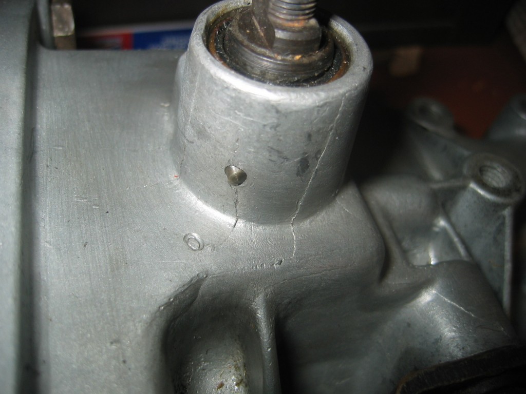 Is this normal? Rebuilt by George Hammer in 05, didn't say anything and I didn't notice until this winter. Don't think I did this as driveshaft was gone though along with a new clutch, etc. Along with the rebuild he put in a new rear bushing in the tailhousing. I took it out this winter to try and repair a leak at the front hole for the countershaft. Picked it up today to move and start the repair and notice the hairline cracks around the housing for the revers shift fork and where the transmission mount is bolted to the tailhousing. Need to be fixed? Appreciate all opinions and suggestions.