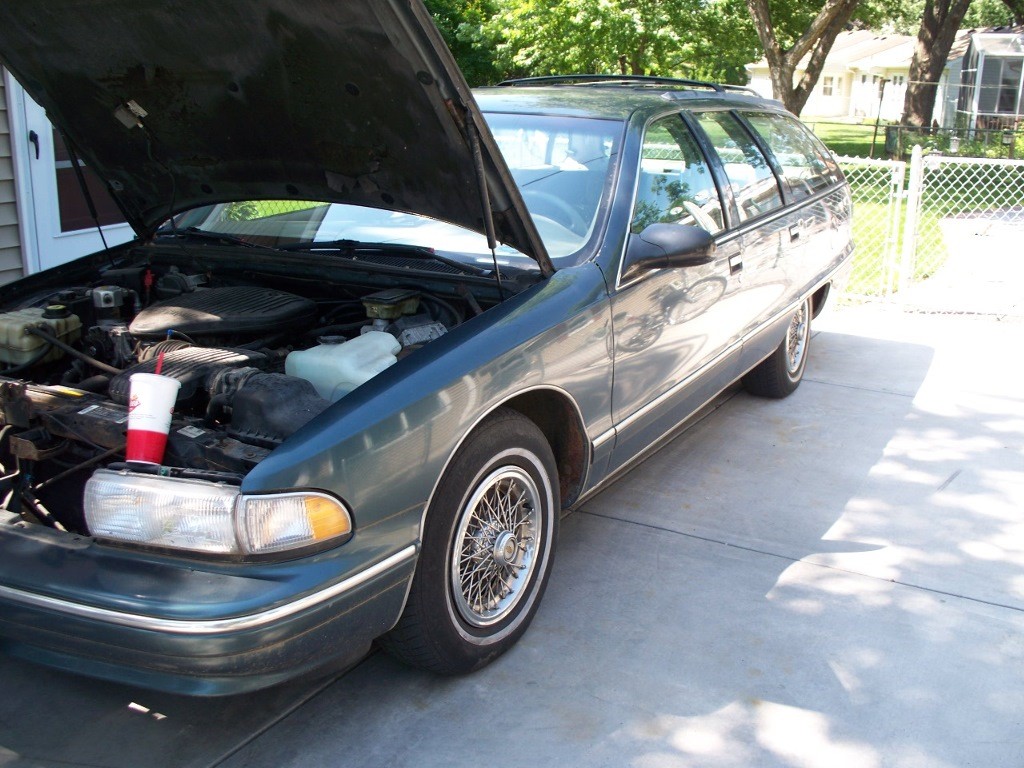 It's a '95 Caprice Wagon, LT1-4L60e, wood delete, gray/green metallic with gray cloth guts. No nasty body rot or rust, a few rock chips that'll need some work. The surprising thing is the rust damage on the front wheelhouses & core support... no where else! Not under the back end, floors, nothing - just under the hood.