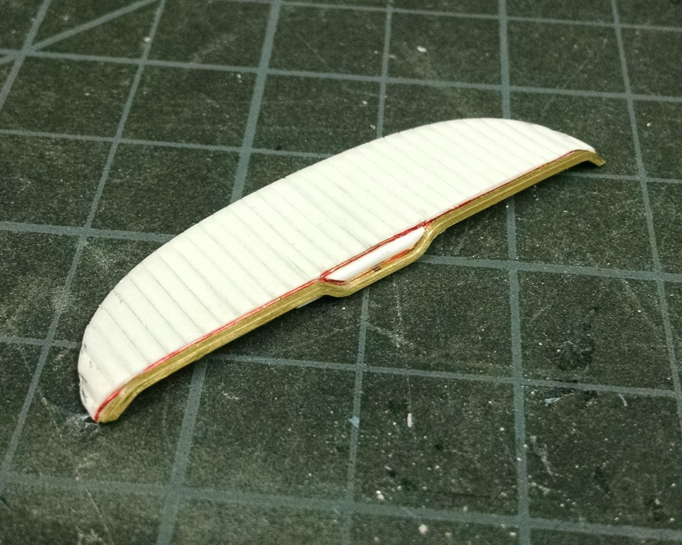 Cut the "humps" off the molded shelf, and bent a piece of brass channel to simulate the chrome band across the top (it will be foiled). A piece of .005 sheet with .060 1/2-round glued on made the "tuck-n-roll" shelf.