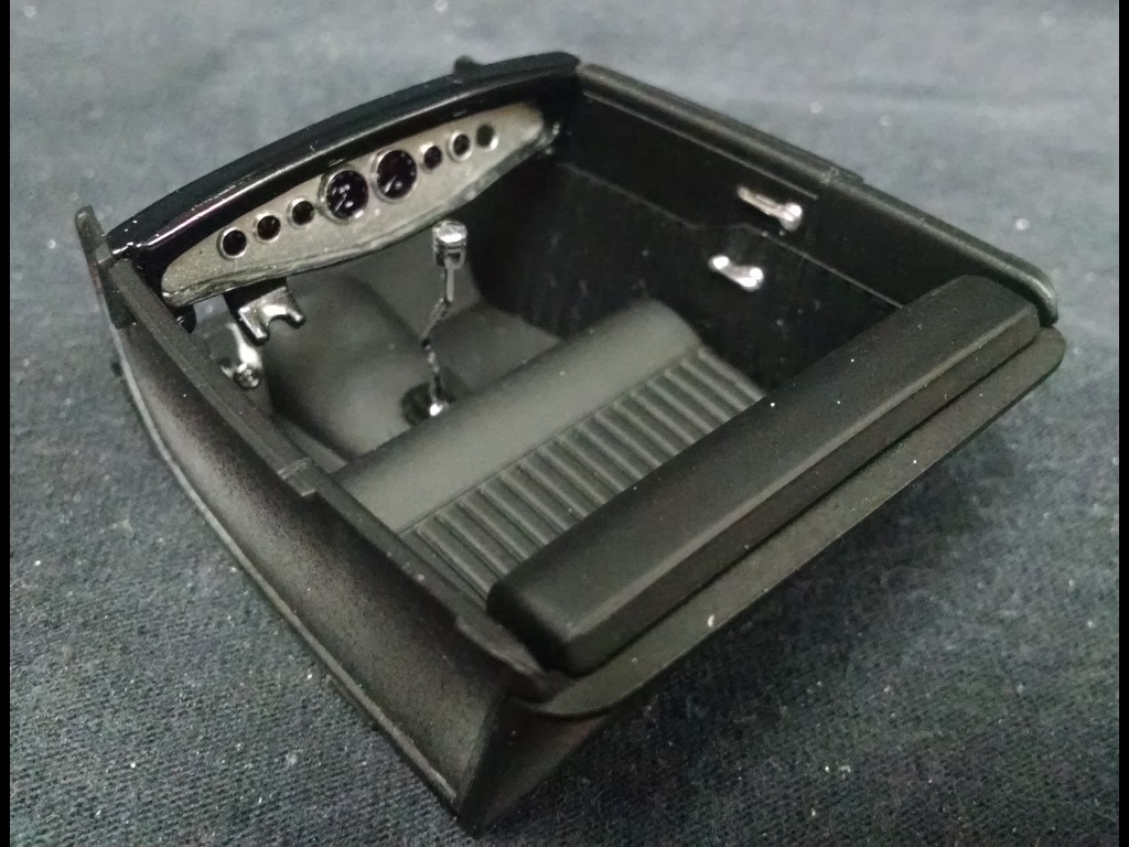 There were never any real detail shots of the interior during the film, other than the "file this under CS... Chicken Sh*t" and when he give the shifter knob to Carol. This model is so tiny, and with the chop-top you can't really even see inside the car! However, my OCD has kicked in, and I built an accurate dashboard (according to the photo's). The photo's reveal that the bulk of the dash is an aluminum panel, punched out for gauges... two large dials (assuming tach & speedo), flanked with 3 on each side... with one of the 6 missing.