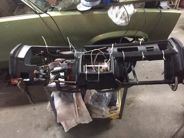 My dash was the standard “idiot light” one. Since I didn’t want to stick a gauge pod under the dash, I bought a complete Monte Carlo SS dash. I bought a dash cap and slipped it in place. And took it off and trimmed and sanded and heated and molded for hours to get it to fit. When I glued it on, I used just about every clamp I own, along with countless zip-ties, and got it to fit pretty well. For some reason, GM changed the pins between lights and gauges, so I had to move a bunch of wires in the connector. While I was doing all that, I cleaned and painted everything. The dash had been cut to install a radio, so I had to replace some metal. I think it is done now.
