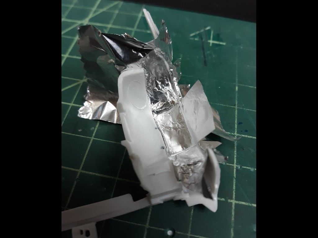 With the nose/front end of the car off, it's a different story. How to create/extend the plastic 1/2 wheelhouses to the fender. hmmmmm. Trying to cut/shape/bend sheet stock proved to be impossible and impractical. Enter my fall-back DDSSAPSAMBF and some aluminum foil.