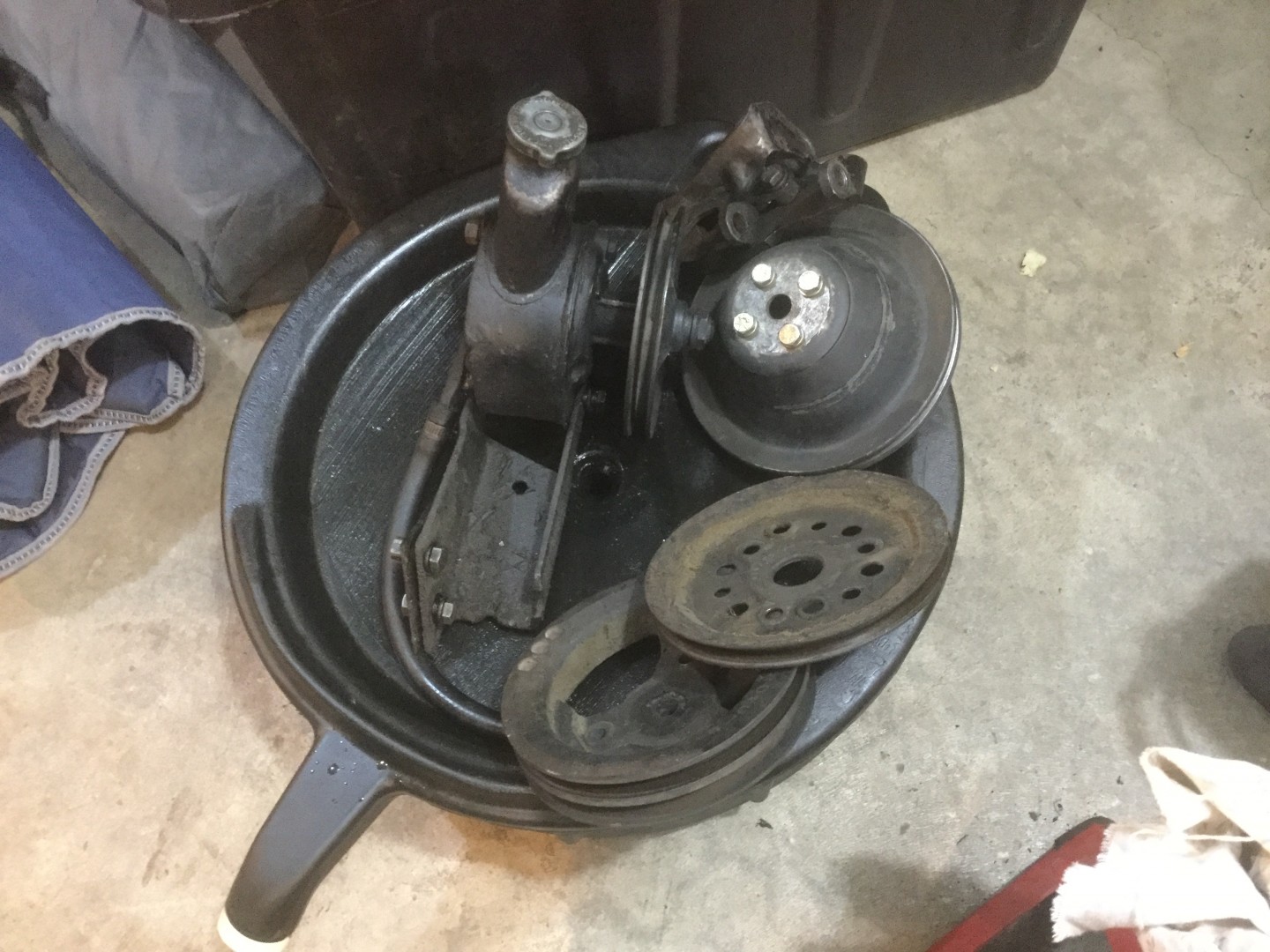 Well cold weather and snow has given me the push needed. Just finished preparing everything to pull the engine except hood and carb need to be removed. Just need to find or buy a lift. 2004r is at rebuilders. Will not finalize the plan until what is discovered when engine is disassembled. Much more to follow. Found two big sources of oil leaks. PS fitting loose, probably for years. Trans plug loose, funny it didn’t fall on the ground. Also appears a piece broken off the lower PS pump bracket or intentionally broken off due to larger SB balancer. And an odd PS crank pulley(appears balanced cast iron).