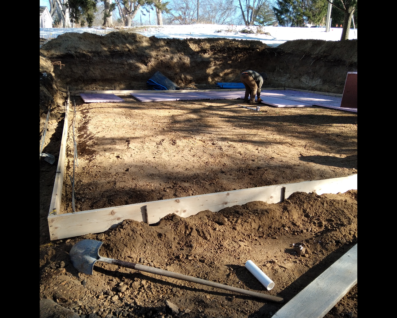 Early March (while I was in the hospital) 1" foam board & firring strips on the block. Due to the building being cut into the hillside, and subsequent backfill loading, the back wall is 12" thick, the side walls are 8".