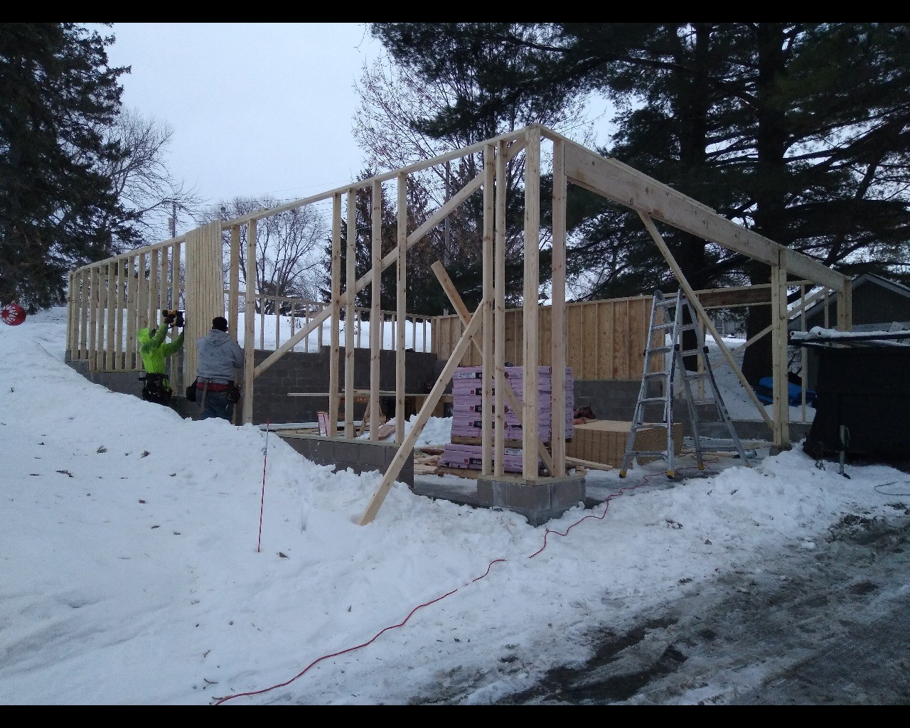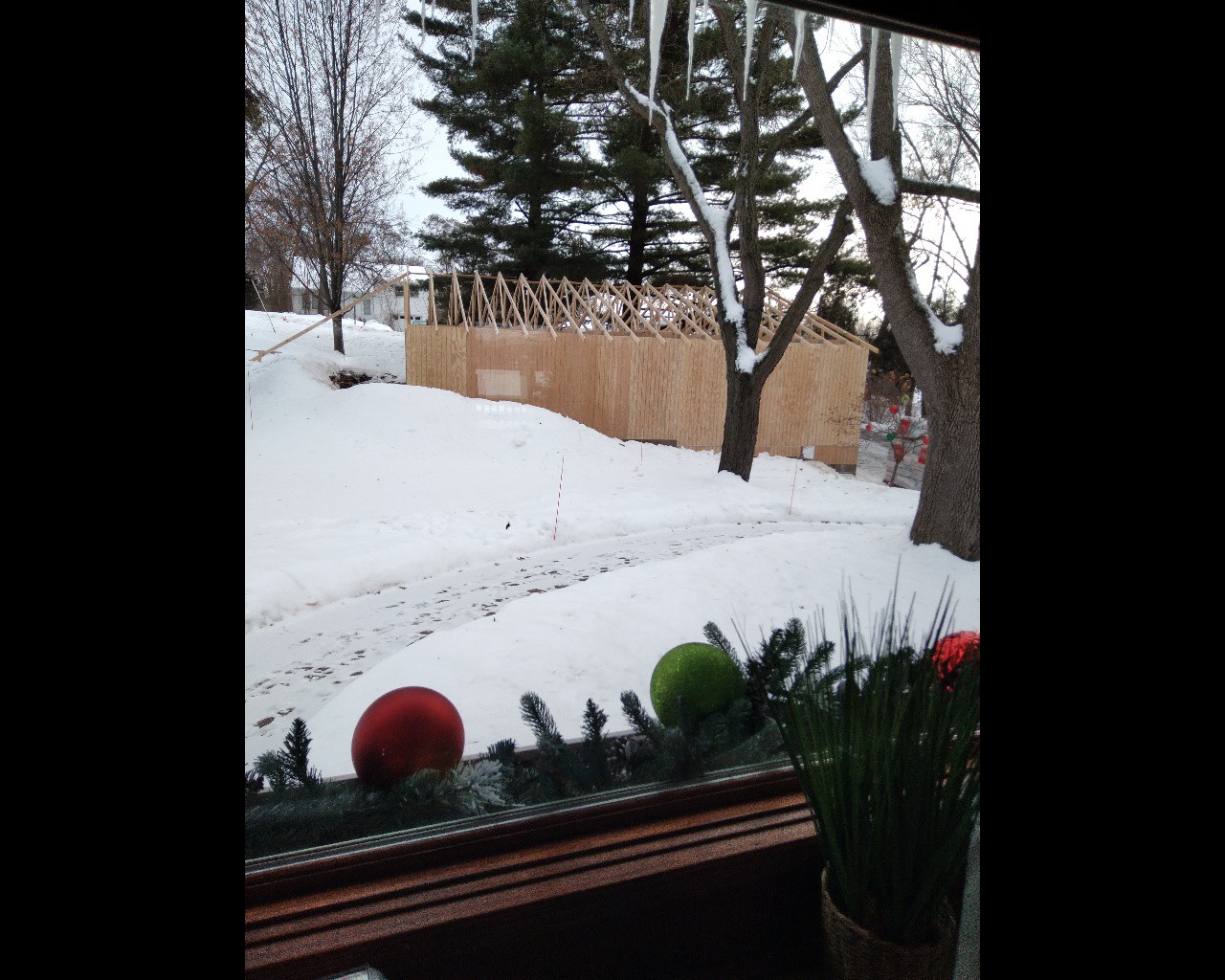 Gonna have to change the name to 100 watt garage for this one. Looks like good progress considering the weather. It will nice to get the roof on so you can quit shoveling out the garage.