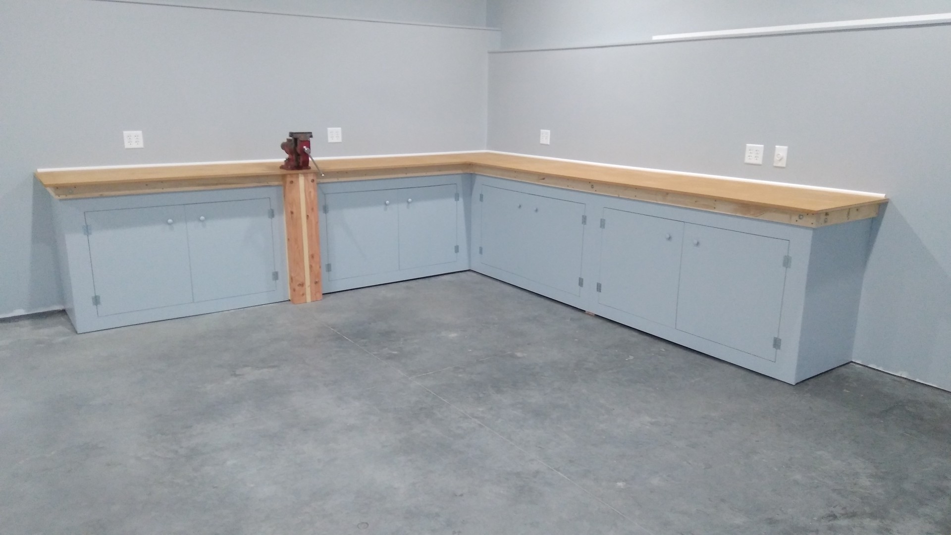 One of my many pet peeves is a wobbly, unstable workbench. Another is lack of depth. Yeah, it's a waste of sheetgoods for a deeper than 24" surface (can't just rip a sheet in half, and double your coverage...), but I like a deeper bench. I also like some concealed storage underneath. I modeled this bench after what I built at the "old" 40 Watt - taking what I liked (and didn't like) and building this setup.