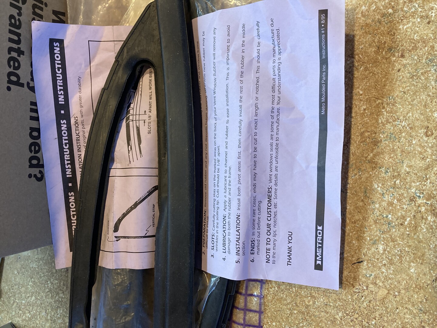 Well I decided to install new vent window weather stripping because I have the assembly out of the door. I bought Metro, their cost about $300, but I got it for less on eBay. I looked over it carefully and all seams good. This is in my 66 but should install in other years. I would appreciate any tips as some of you may have done this. Installation #6 seems to indicate there might be an issue. And the Note At the end has me wondering.