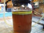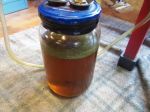 I used my vacuum pump & bleeder rig to suck the stuff that used to be gasoline out of the tank. The "layer" showing on the fluid is about 8oz. of former gasoline left in the tank. Make note of the CRUD floating... just waiting to get sucked up into the passages and jets.