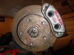 Going to a dual piston caliper on the front of the camaro. This is a Baer serious street kit I believe is what that they called it. I don't know if they make this kit anymore. It is basically mustang cobra calipers with the stock 11" camaro rotors and custom brackets that bolt on to the stock spindles. I happened to have a set of drum spindles laying around so I mocked everything up to see how it all fit. I plan on buying some drilled and slotted rotors to go with it.