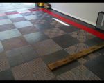 We un-boxed the flooring, and started to lay the tiles down. Working from the chalk lines and nudging the ever-building field square to them. After awhile enough were down it stayed put - then you can go crazy. Snapping down 40 sq.ft. in 10 minutes isn't even breaking a sweat - once you get the pattern down, and the "sex" of the tiles established it goes really fast.