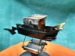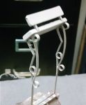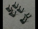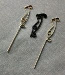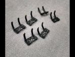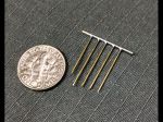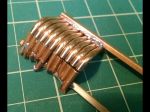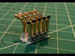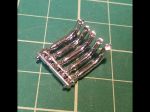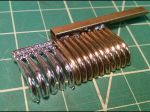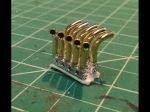 The other project was the totally clunky side-steps. Again some plastic blobs with a little scroll-detail in them. Using some scrap PC board material (again from the LED era) I carved a slotted rectangle in the sizes needed for the 4 front, and 2 rear steps. Using some brass sheet cut in 5/64" strips, they were bent into rectangles and set in the groove. The next challenge was to bend 36 little loop-de-loops. Using some brass rod, I made a jig to bend them (more or less) identical. The next step will be to solder the loops into the frames.