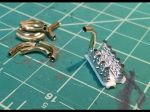 The other project was the totally clunky side-steps. Again some plastic blobs with a little scroll-detail in them. Using some scrap PC board material (again from the LED era) I carved a slotted rectangle in the sizes needed for the 4 front, and 2 rear steps. Using some brass sheet cut in 5/64" strips, they were bent into rectangles and set in the groove. The next challenge was to bend 36 little loop-de-loops. Using some brass rod, I made a jig to bend them (more or less) identical. The next step will be to solder the loops into the frames.