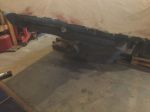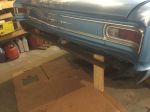 Bumper brackets, basted, primed with 2K epoxy, and finished in satin black. Removed all sign of rust from back side of Rear bumper, skufffed, primed with 2K epoxy, and finished with a chrome enamel. Need to drop gas tank to finish back side of frame, then install bumper and re- install gas tank. Cleaning and refinishing bolts, special washers, and nuts, except new SS capped bumper bolts.